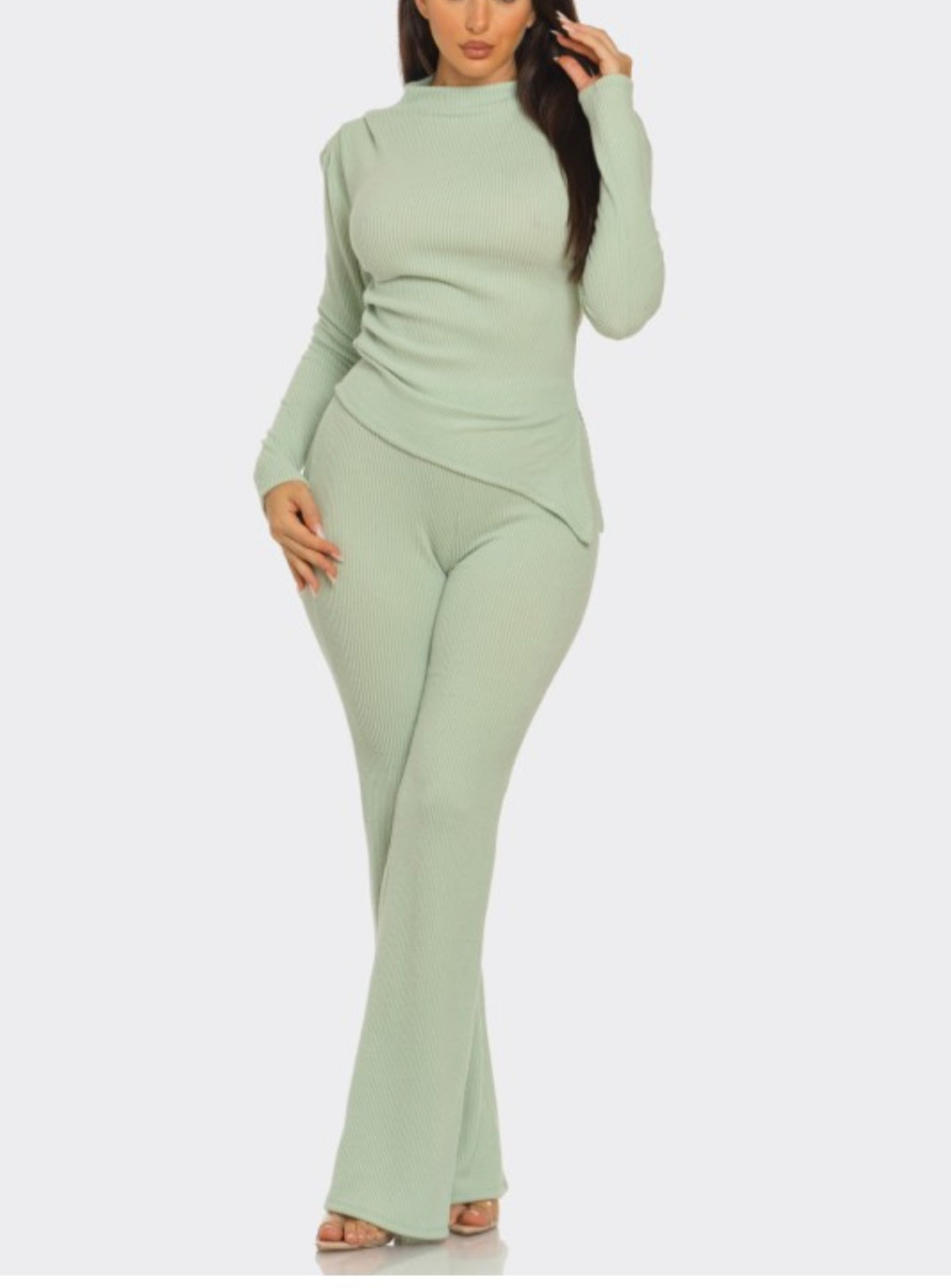 This set has a soft washed ribbed knit material. It features a funnel neckline and elastic waistband. It is super stretchy and has a split hem line.
